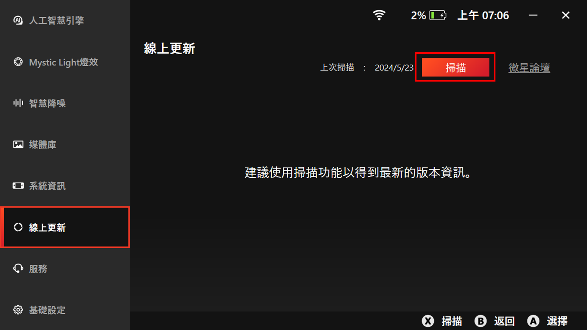 2. 至設定 > "線上更新",然後按下"掃描"按鈕檢查更新
