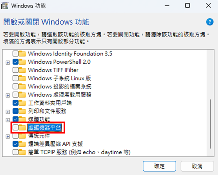 2. 關閉「虛擬機器平台」並按「確定」套用更改,然後重新啟動系統以使更改生效。