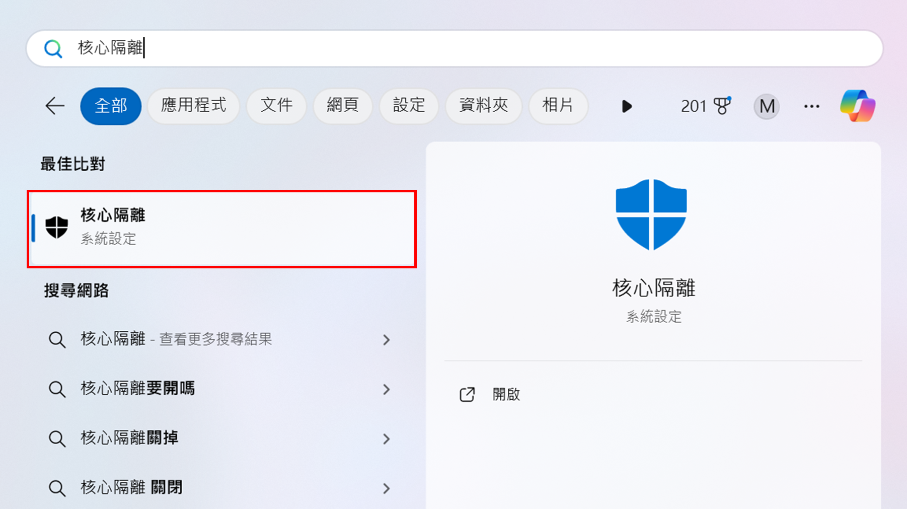 1. 在 Windows 搜尋中輸入“核心隔離”,然後開啟系統設定頁面。