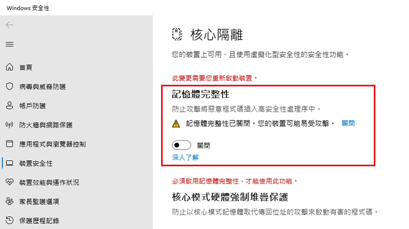 選項一、停用“核心隔離 (Memory Integrity)”