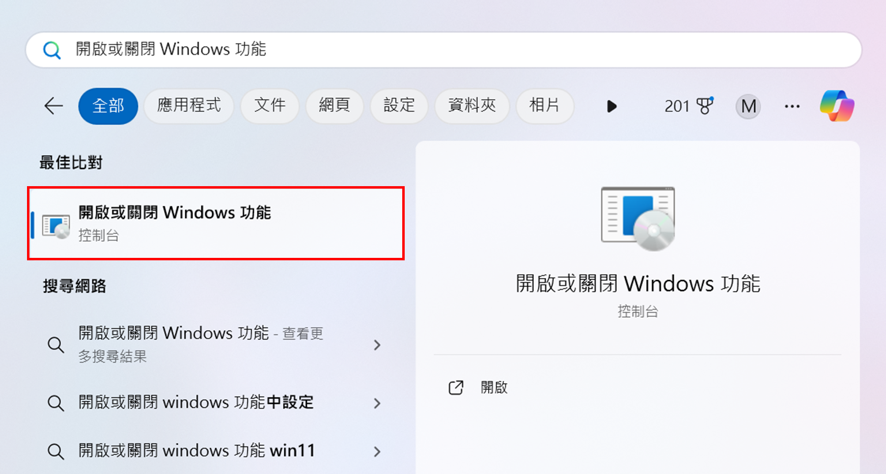 1. 在 Windows 搜尋列中輸入“開啟或關閉 Windows 功能”,然後開啟設定頁面。