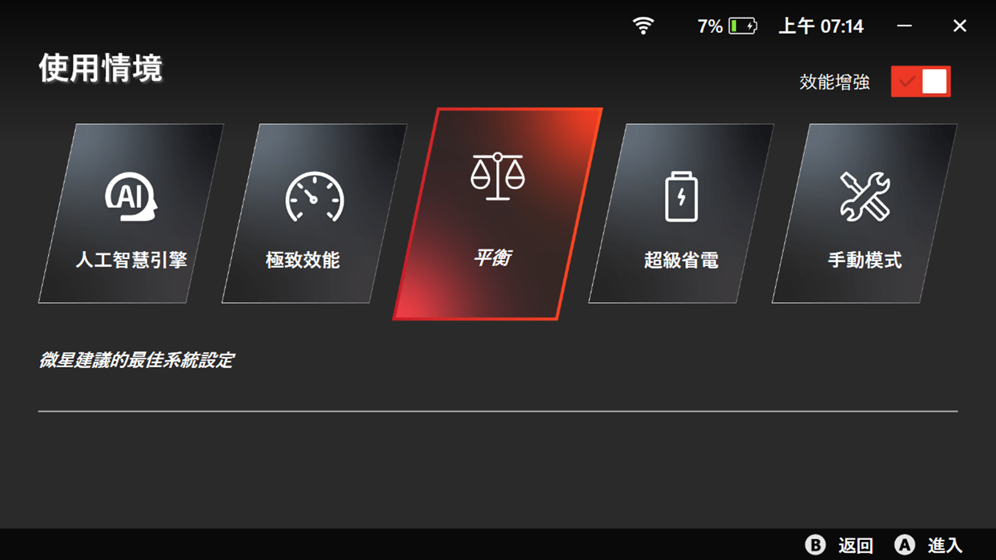 *註2:以下設定僅適用於 MSI Claw A1M 和 Center M v1.0 版本。