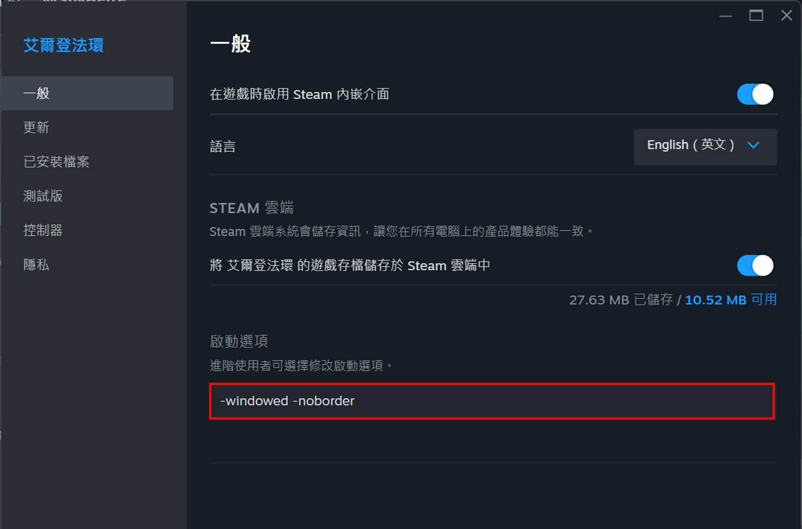 b. 在"一般"頁面下,在啟動選項中輸入"windowed –noborder",然後啟動遊戲。