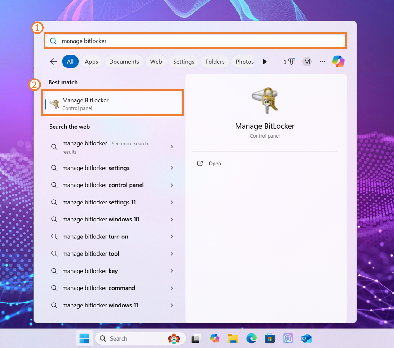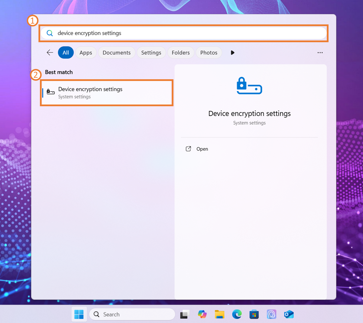 1. Enter "Device Encryption Settings" in Windows search bar.
