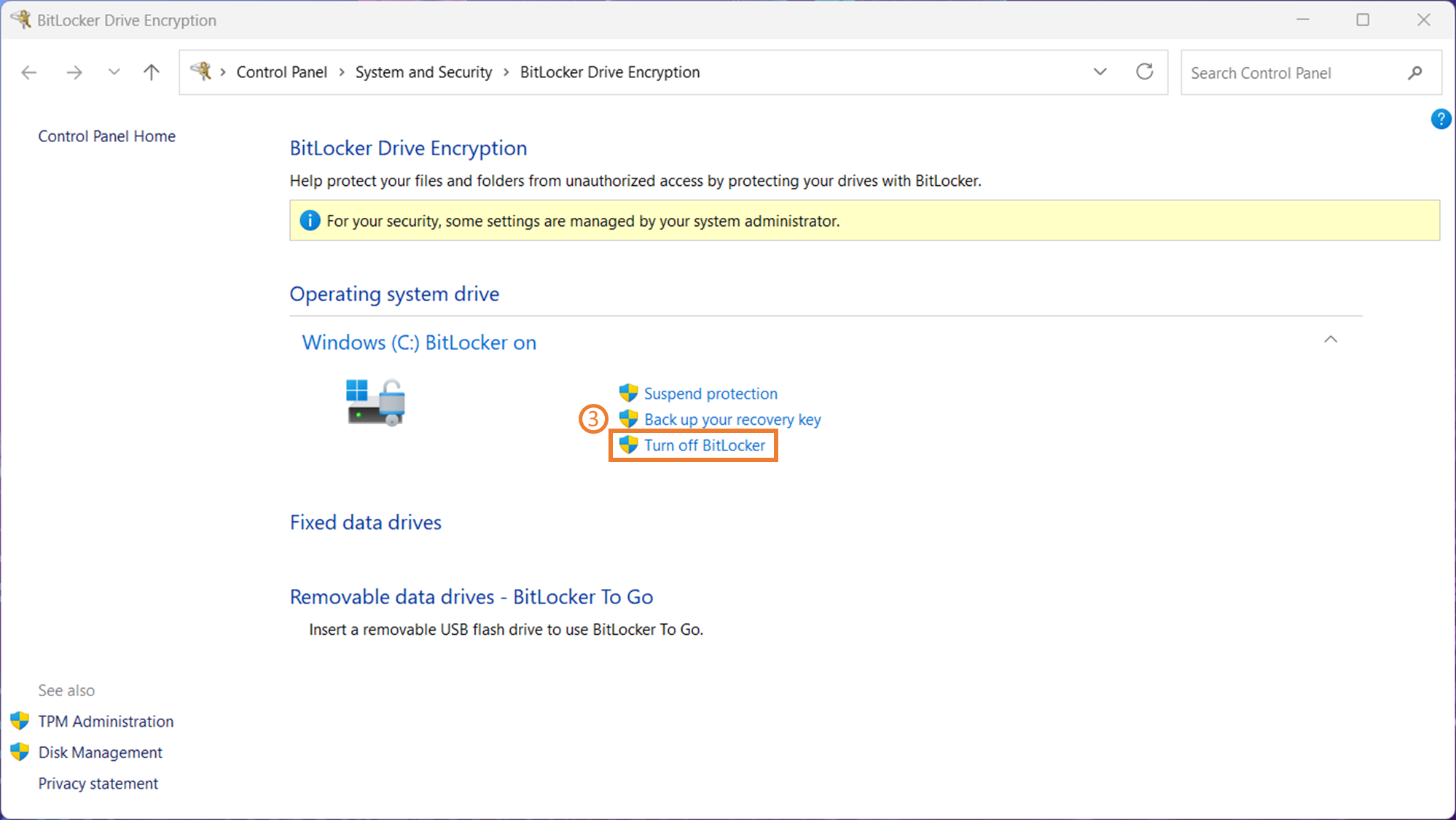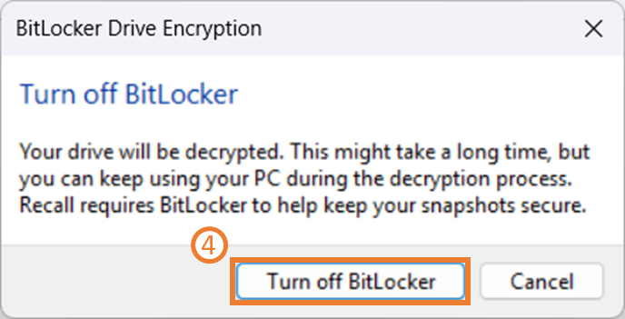 4. When popping up the confirmation, click "Turn off BitLocker" to disable BitLocker.